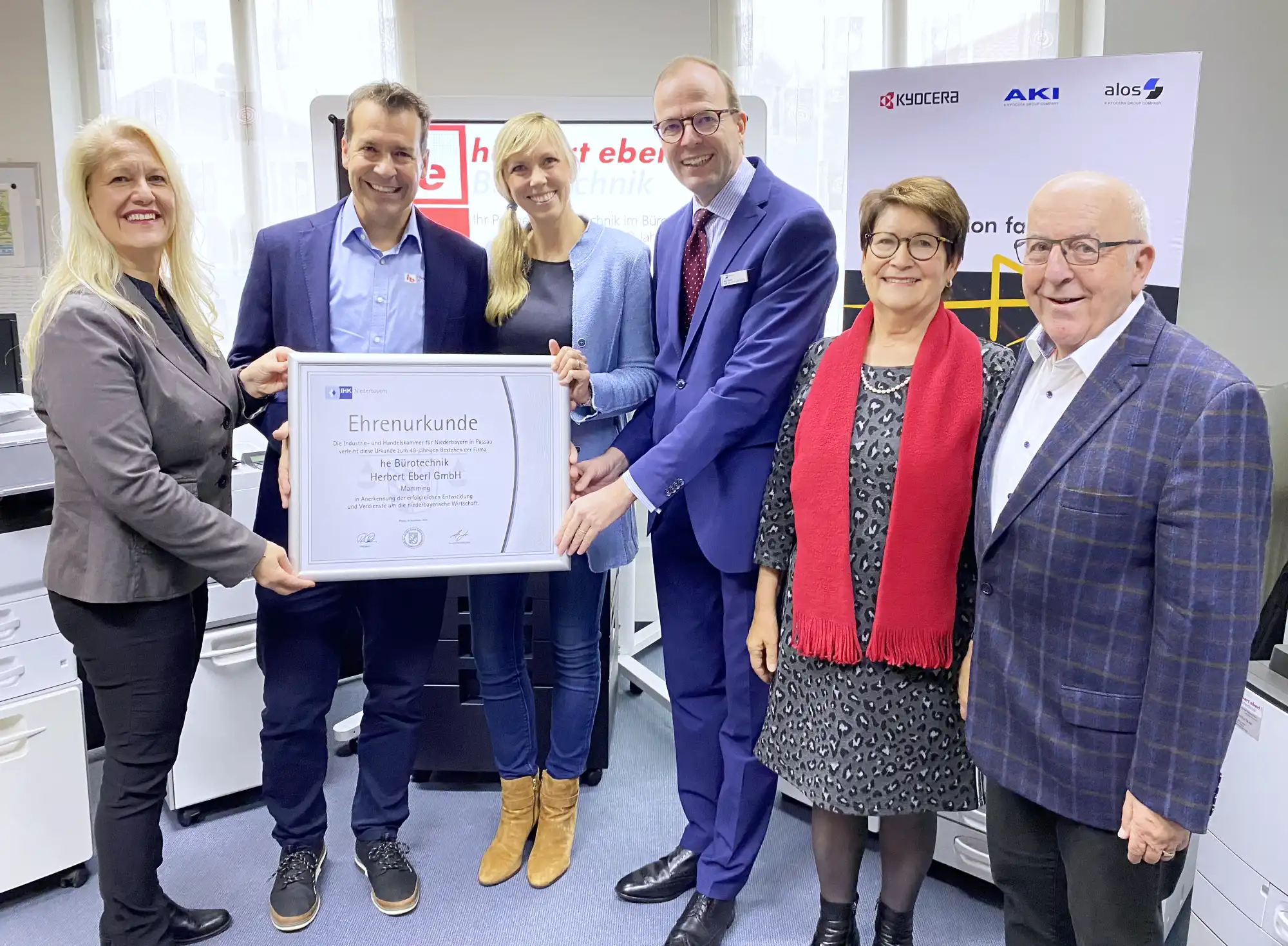 Über einen Zeitraum von 40 Jahren hinweg hat sich die Arbeit im Büro massiv verändert – ein Weg von Schreibmaschine und Aktenordner hin zur umfassenden Digitalisierung. Diesen Weg ist die Firma Bürotechnik Eberl aus Bubach bei Mamming mitgegangen und begleitet ihre regionalen wie überregionalen Kunden bis heute bei deren Weiterentwicklung im Büro. Für diese erfolgreiche unternehmerische Aufbauarbeit über zwei Generationen hinweg hat IHK-Vizepräsident Max-Georg Graf von Arco auf Valley der Unternehmerfamilie eine IHK-Ehrenurkunde zum Betriebsjubiläum verliehen.
